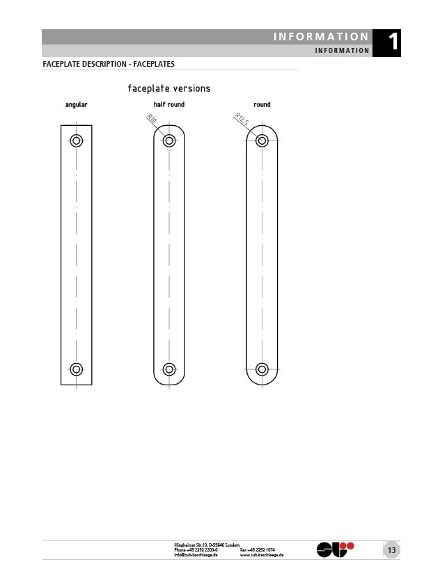 INFORMATION I N F O R M A T I O N 1 FACEPLATE DESCRIPTION - FACEPLATES Illingheimer Str.10, D-59846 Sundern Phone +49 2393 2200-0 Fax +49 2393 1074 info@sub-beschlaege.de www.sub-beschlaege.de 13